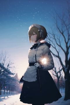 1girl, maid headdress, solo, weapon, gun, gloves, apron, holding, maid, tree, brown hair, short hair, holding weapon, black gloves, holding gun, snow, rifle, snowing, outdoors, jacket, dress, maid apron, white jacket, brown eyes, closed mouth, yellow eyes, long sleeves, bow, white bow, bowtie, ribbon, bangs, bare tree, coat, looking away, black dress, winter