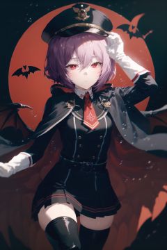 1girl, solo, hat, uniform, red eyes, remilia scarlet, military uniform, bat (animal), wings, necktie, gloves, military, alternate costume, bat wings, white gloves, belt, looking at viewer, long sleeves, boots, short hair, thighhighs, military hat, peaked cap, black necktie, adjusting clothes, hair between eyes, coat, armband, shirt, cape, black headwear, closed mouth, skirt, light purple hair, slit pupils, purple hair, black coat, thigh boots, black thighhighs