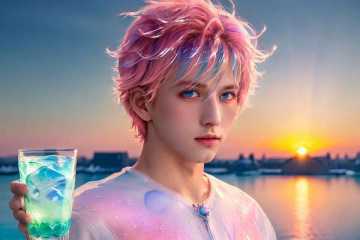 <lora:handsome:0.7> solo, blue eyes, short hair, looking at viewer, upper body, 1boy, pink hair,cup, sunset, beautiful detailed glow,detailed ice,beautiful detailed water,(floating palaces:1.2),(ice crystal texture wings),(Iridescence and rainbow hair:2.5),