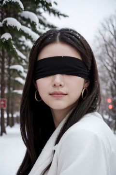 gufeng,1,1girl,long hair,solo,blindfold,jewelry,earrings,blurry background,upper body,white hair,blurry,covered eyes,snowing,closed mouth,lips,snow,facing viewer,black blindfold,ribbon,japanese clothes,