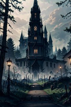 Forest, Castle, Gothic, best quality, 8K, cinematic lighting, ultra HD, masterpiece,