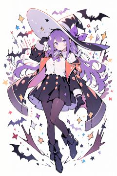 kafuka, 1girl, solo, gloves, pantyhose, purple hair, Wizard's hat, Bat hairpins, sunglasses, eyewear on head, large breasts, white shirt, black short, black footwear, boots, bangs, long sleeves, purple eyes, jacket, 1girl, macron, blackmagic, JaLanteen,