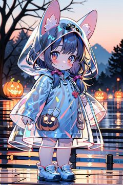 masterpiece,best quality,4k,1girl,raincoat,pop style,glowing,solo,looking at viewer,halloween,pumpkin,blush,long hair,bangs,brown hair,animal ears,brown eyes,standing,outdoors,shoes,blurry,tree,see-through,night,blurry background,animal hood,<lora:GlowingPP:0.7>,