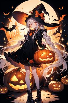 WANSHENG, 1girl, hat, solo, witch hat, long hair, bow, flower, black headwear, boots, long sleeves, black footwear, very long hair, socks, butterfly, looking at viewer, bangs, hair bow, black bow, holding, dress, full body, halloween, white hair, closed mouth, rose, standing, witch, black dress, braid, sparkle, bowtie, blush, frills, hair ornament, jack-o'-lantern, hair between eyes, hat flower, orange eyes, red eyes, red flower, puffy sleeves, striped bow