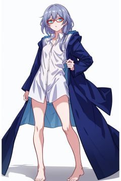 (masterpiece:1.3),(the best quality:1.2),(super fine illustrations:1.2),(Masterpiece),high quality,high detail,(white background:1.2),looking at viewer,(SOLO:1.4),outline,simplebackground,, long hair,red-framed eyewear,blue eyes,bangs,hair ornament,long sleeves,blue jacket,hair between eyes,fu hua,thighhighs,messy hair,hooded jacket,hood down,side ponytail,hood,collarbone,white shirt,coat,barefoot,puffy sleeves,low ponytail,grey hair,
