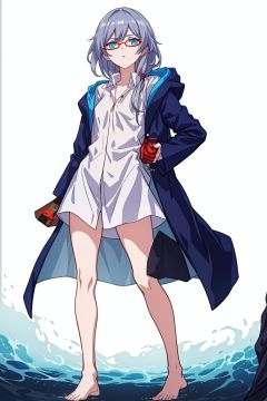 (masterpiece:1.3),(the best quality:1.2),(super fine illustrations:1.2),(Masterpiece),high quality,high detail,(white background:1.2),looking at viewer,(SOLO:1.4),outline,simplebackground,, long hair,red-framed eyewear,blue eyes,bangs,hair ornament,long sleeves,blue jacket,hair between eyes,fu hua,thighhighs,messy hair,hooded jacket,hood down,side ponytail,hood,collarbone,white shirt,coat,barefoot,puffy sleeves,low ponytail,grey hair,