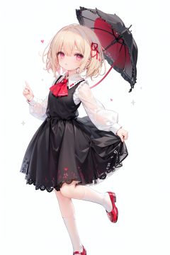 1girl, rumia, blonde hair, solo, white background, red eyes, red footwear, simple background, ascot, short hair, ribbon, open mouth, hair ribbon, smile, long sleeves, shirt, looking at viewer, red ascot, white socks, white shirt, red ribbon, shoes, socks, frills, bangs, outstretched arms, hair between eyes, skirt, :d, dress, vest, mary janes, black dress, black skirt, collared shirt, black vest, blush