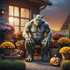 monsters gardening infront flowerpots and gardening tools,  autumn eve,  halloween season,  ((best quality)),  ((masterpiece)),  ((ultra-detailed)),  high resolution, , , , ,