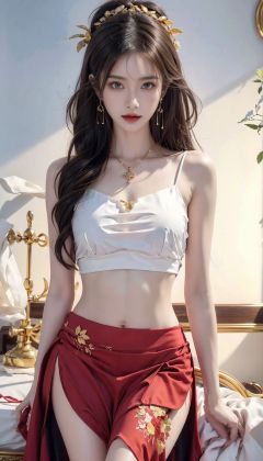 High quality, masterpiece, 1 girl, golden headdress, long hair, red scarf, ponytail, earrings, necklace, camisole, red skirt, embroidery, exposed legs, navel,golden light, gufeng, wangyushan