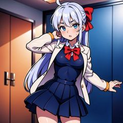 Arya, 1girl, solo, long hair, blue eyes, ahoge, bow, looking at viewer, red bow, jacket, bowtie, long sleeves, breasts, shirt, open jacket, red bowtie, door, cowboy shot, collared shirt, indoors, school uniform, white hair, standing, open clothes, skirt, bangs, dress, grey jacket, black dress, blush, pleated skirt, parted lips, medium breasts, pleated dress, white shirt, hair between eyes, white jacket, hand up, blazer, black skirt, thighs, open door, hallway,girl,ANIME