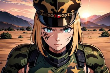best quality,ultra-detailed,portraits,gritty,desert camouflage,serious expression,harsh lighting,steely gaze,thousand-yard stare,detailed insignia,confident posture,military cap,combat boots,camouflaged face paint,dust and debris,fading sunset colors,weathered armor,scars,smoke and gunfire,battlefield chaos.