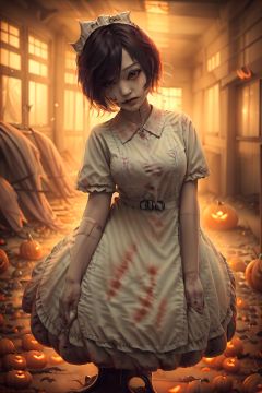 1girl,<lora:hushi:0.7>,plump,(((happy_halloween))),highres,swirl,wide_shot,cowboy_shot,evil smile,wallpaper,photo_(medium),reality,short hair,multicolored hair,((lotus_position)),