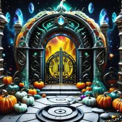 ((realistic,digital art)), (hyper detailed),h4l0w3n5l0w5tyl3DonML1gh7 Enchanted Portal Gateways, Magical Runes,Spyglass,Closet Organizers,Shoe Rack, Tapestry with Metal Threads tapestry,Laminate,Exposed Aggregate Concrete, Campfire, Floor Lamps, fantasy, <lora:h4l0w3n5l0w5tyl3DonML1gh7-XLv1.2-000006:1>