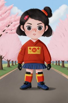 Masterpiece: 1.5, UHD, best quality, 16k,Masked knight build, mecha, samurai, samurai helmet, katana, slashing, power armor, exoskeleton, punk style, poster. Aspect ratio, battle flag, young girl, pink, JK-style skirt, black knee-high socks, cherry blossoms. The design has a modern punk vibe, featuring an exoskeleton, a headband, gloves, and a school uniform., miji,