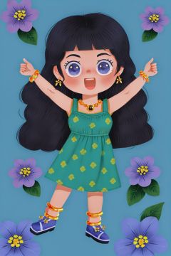 blue flower, flower, hydrangea, white flower, bracelet, 1girl, lily \(flower\), daisy, bell, blue rose, long hair, purple flower, solo, jewelry, breasts, dress, blue theme, arms up, open mouth, armpits, looking at viewer, medium breasts