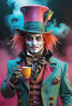 cyberpunk (mad hatter johnny depp in wonderland:1.3) holding a cup of tea,cyberpunk style,mysterious magical ground fog,bioluminiscent drink,graffito,mist,incredible detailed,soft neon light,cinematic,iridescent red,vivid details,robotic bionic features,whimiscal toxic dust,hyperrealistic masterwork by head of prompt engineering