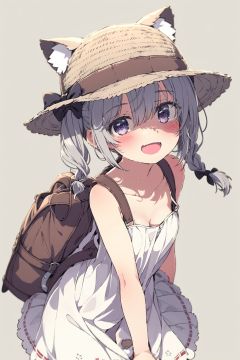 1girl,solo,hat,dress,braid,animal ears,purple eyes,smile,open mouth,brown headwear,white hair,long hair,fang,:d,see-through,cat ears,bow,blush,white background,white dress,bangs,hair between eyes,see-through silhouette,red bow,looking at viewer,sleeveless dress,black bow,bag,sleeveless,straw hat,twintails,no panties,collarbone,simple background,bare shoulders,hat bow,two side up,animal hat,frilled sundress with frills,(detailed eyes:1.5),