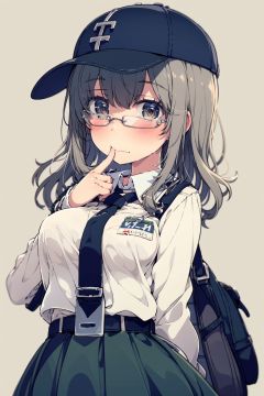 1girl, solo, green headwear, shirt, glasses, hat, white shirt, long hair, skirt, open clothes, belt, bag, long sleeves, simple background, long skirt, jacket, necktie, collared shirt, black necktie, round eyewear, closed mouth, looking at viewer, hand up, brown eyes, white background, grey hair, black-framed eyewear, holding, pocket, open jacket, green jacket, standing, buckle, shoulder bag, belt buckle, wing collar, black belt, shirt tucked in, bangs, breast pocket, green skirt, wavy hair, feet out of frame, blush, high-waist skirt, buttons, name tag, character name,(detailed eyes:1.5),