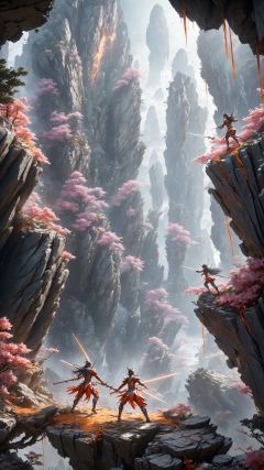 (Chinese fantasy style)(Hyperrealistic game thick paint style: 1.5) Complex details, scenes close-up sword fairy duel, in a small space on a mountain or cliff, two sword fairies are preparing for a fierce sword duel. Their swords glowed with silver, and the surrounding rocks were cut into pieces by the sword
