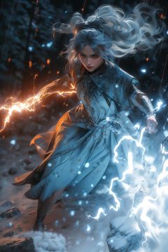 masterpiece,best quality,ultra-detailed,1girl,(blue lighting:1.2),(blue electricity:1.2),(wrapped in electricity all over the body:1.2),black_background,rain,white hair,white dress,<lora:雷法:1>,<lora:女三:0.3>,