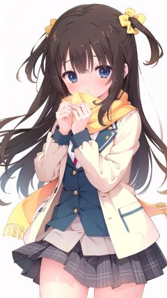 1girl, solo, skirt, scarf, long hair, white background, blush, one side up, simple background, plaid, looking at viewer, brown hair, school uniform, jacket, yellow scarf, pleated skirt, plaid skirt, covering mouth, holding, grey skirt, cowboy shot, scrunchie, polka dot