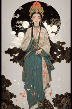 masterpiece,best quality,8K,HDR,exquisite details,1girl,<lora:Chinese Gongbi painting-000009:0.6>,goddess zi on the moon flying near the pond with some lotus flowers,Holding a white rabbit,in the style of harmonious color palette,multilayered compositions,detailed character design,nightmarish illustrations,light amber and green,traditional costumes,vibrant murals,