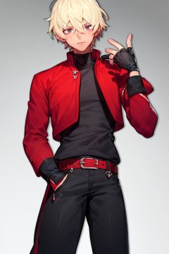 1boy,solo,male focus,fingerless gloves,gloves,yellow background,belt,jacket,pants,simple background,black gloves,red jacket,long sleeves,shirt,hair between eyes,black shirt,closed mouth,bangs,black pants,looking at viewer,belt buckle,glowing,2qhuafeng,<lora:2qhuafeng-000008:0.6>,