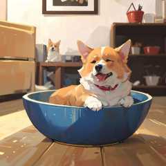 (masterpiece:1.2), best quality,PIXIV, corgi style by snatti,no humans, pet bowl, dog, bowl, animal focus, indoors, blurry, animal, lying, blurry background, sleeping, closed eyes<lora:corgi style by_20231101164707-000014:0.7>