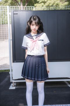 cinematic lighting, Surrealism, chiaroscuro, depth of field, Fujicolor, UHD, textured skin, anatomically correct, high details, award winning, super detail, 16k, retina, 1080P, best quality,YOYO, solo, 1girl, thighhighs, pink neckerchief, skirt, school uniform, white thighhighs, kitauji high school uniform, pleated skirt,  neckerchief, loafers, photo background, standing, white shirt,