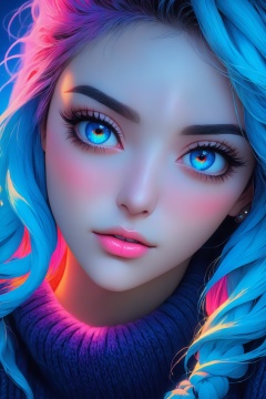 realistic,detailed,anime-style,1girl,beautiful detailed eyes,beautiful detailed lips,extremely detailed eyes and face,long eyelashes,Sweater,order,Blue gradient background,Neon hair,Textured crop,Canadian,(masterpiece:1.2),(best quality),(niji style),vivid colors