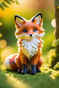 A cute fox,fluffy fur,adorable active eyes,playful paws,cosy sleeping spot,soft whiskers,beautiful patterned coat,bright and expressive eyes,curious and playful nature,smooth and sleek body,graceful and agile movements,[fox toys],[green garden background],[colorful sunlight filtering through the trees],[vibrant and cheerful atmosphere],(best quality,ultra-detailed),[soft lighting],realistic colors, [bokeh]