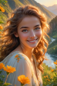 (best quality,8k,highres,masterpiece:1.2),photorealistic,ultra-detailed,vibrant photography of a woman in nature, cute smile,dramatic lighting,finely detailed beautiful eyes,fine detailed skin,Natural scenery,majestic landscape,colorful flowers,distant mountains,flowing rivers,melting sunset,serene atmosphere,dazzling sunlight,blissful vibes,freckled face,luscious greenery,soft breeze,ethereal beauty