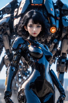 (best quality:1.2,4k,8k,highres,masterpiece:1.2),1girl,genshinmona,beautiful detailed eyes,beautiful detailed lips,black hair,bodysuit,full body,mechanical arms,medium breasts,science fiction,solo,standing,simple background