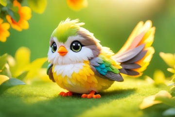 A cute bird,fluffy fur,adorable active eyes,playful paws,cosy sleeping spot,soft whiskers,beautiful patterned coat,bright and expressive eyes,curious and playful nature,smooth and sleek body,graceful and agile movements,[bird toys],[green garden background],[colorful sunlight filtering through the trees],[vibrant and cheerful atmosphere],(best quality,ultra-detailed),[soft lighting],realistic colors, [bokeh]