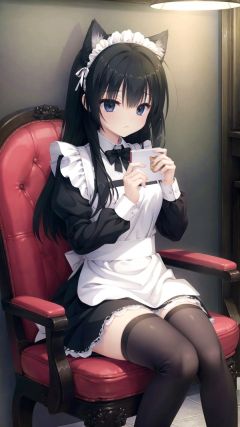 1girl, animal ears, thighhighs, fake animal ears, maid, solo, sitting, chair, cat ears, long hair, black hair