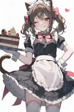 detailed eyes, 1girl, animal ears, solo, one eye closed, food, cat ears, tail, bow, tongue out, apron, tongue, cat tail, bell, maid, maid headdress, holding, short sleeves, dress, red eyes, hand on hip, cat girl, ahoge, frills, white background, looking at viewer, cake, hair ornament, black dress, black hair, twintails, white apron, heart, thighhighs, puffy sleeves, hair bow, neck bell, maid apron, white thighhighs, bangs, puffy short sleeves, simple background, pink bow, frilled apron, red bow, gloves, jingle bell, ribbon, short hair, smile, frilled dress, white gloves, hairclip, bowtie, wrist cuffs, short twintails, closed mouth, brown hair, blush, holding plate, standing, collar, ;p
