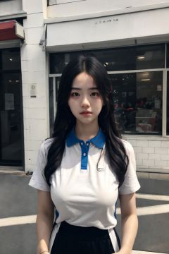 Ultra-high skin detail,Perfect facial details,cinematic lighting,chiaroscuro,super detail,award winning,best quality,FilmGirl,85mm,1girl,18 years old,sad,little cry,the abovehalf body,Lolita,Beautiful body,xiaofu,collared shirt,short sleeves,long hair,looking at viewer,standing,outdoors,HUGE breasts,pants,upper body,blue collar,