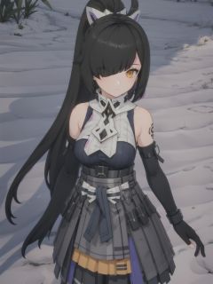 1girl, solo, gloves, black hair, looking at viewer, hair over one eye, bare shoulders, elbow gloves, black gloves, bangs, tattoo, yellow eyes, fingerless gloves, jewelry, sleeveless, earrings, closed mouth, orange eyes, breasts, barcode, pouch, detached sleeves, cowboy shot, skirt, bupoxiaoXF,