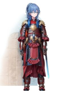 (masterpiece:1.3), (the best quality:1.2), (super fine illustrations:1.2), (Masterpiece), high quality, high detail, ((white background:1.2)), looking at viewer, (SOLO:1.4), outline, , simple background,blue eyes,hair between eyes,armor,shoulder armor,fu hua,gloves,grey hair,braid,messy hair,sheathed,sword,ponytail,jewelry,pauldrons,full armor,gauntlets,breastplate,