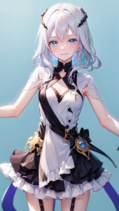 masterpiece,bestquality,highlydetailed,ultra-detailed,hmlacia,leicia,(purple hair:white hair:blue hair:1.125),long hair,hair ornament,ice blue eyes,delicate eyebrows,(solo),1 girl, (minimal makeup:0.8), (natural beauty:1.2), (smiling expression:1.1), (standing pose:1.2), (neutral background:1.3), (soft lighting:1.1), (subtle shadows:1.1), (pastel colors:1.2), (simple composition:1.2), (clean lines:1.1), (relaxed atmosphere:1.2)