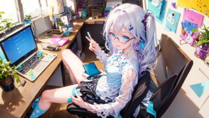 masterpiece, bestquality, highlydetailed, ultra-detailed, hmlacia, leicia, (purple hair:white hair:blue hair:1.125), long hair, hair ornament, ice blue eyes, delicate eyebrows, (solo:1.2),1 girl, working in a cute and cozy office setting, (adorable:1.2), (bright colors), (playful decor), (polka-dot blouse:1.3), (floral skirt), (colorful socks), (bunny slippers:1.1), (glasses:1.2), (pigtails), (focused expression), (organized workspace), (colorful stationery), (cute accessories), (smiling laptop), (cheerful atmosphere), (inspiring quotes), (whimsical artwork:0.9), (comfortable desk chair:1.2), (paperwork), (colorful sticky notes:1.1), (positive vibes:1.3), (fun office supplies), (cute office gadgets), (office plant), (productive work ethic), (delightful work environment), (happy and efficient), (enjoying her tasks)