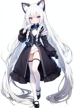 1girl, white_gloves, braid, full_body, gloves, long_hair, official_alternate_costume, pointy_ears, simple_background, solo, standing, very_long_hair, white_background, white hair, blue eyes, paw claw pose, open_mouth