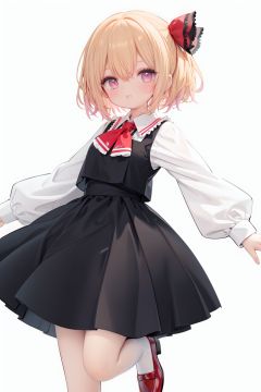 1girl, rumia, blonde hair, solo, white background, red eyes, red footwear, simple background, ascot, short hair, ribbon, open mouth, hair ribbon, smile, long sleeves, shirt, looking at viewer, red ascot, white socks, white shirt, red ribbon, shoes, socks, frills, bangs, outstretched arms, hair between eyes, skirt, :d, dress, vest, mary janes, black dress, black skirt, collared shirt, black vest, blush