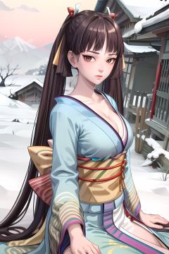 yuanshen, 1girl, solo, japanese clothes, kimono, long hair, sash, brown eyes, twintails, looking at viewer, snow, bangs, obi, brown hair, blunt bangs, outdoors, red ribbon, makeup, tree, blue kimono, ribbon, upper body, very long hair, hair ribbon, closed mouth, black hair,<lora:add_detail:0.5>,<lora:epiNoiseoffset_v2:0.5>,<lora:EnvyBetterHands LoCon_beta2:1>,perfect hands,<lora:阿离1:0.8>,front view,cleavage,sitting,mature female,