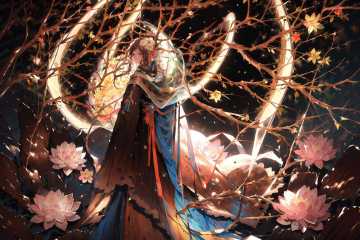 (masterpiece:1.2),best quality,PIXIV,coloured glaze,1girl,flower,solo,hair ornament,shawl,hanfu,hair flower,looking at viewer,looking back,branch,chinese clothes,brown eyes,long hair,dress,holding,ribbon,brown hair,lotus,long sleeves,from behind,antlers,standing,<lora:coloured glaze-000018:1>,