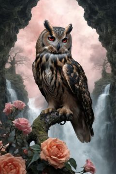 fractal art,black and red hue, a burst of plasma big owl on a branch, a huge waterfall in the background,dream, ornate, explosion of liquid whimsical fantasy elegant rose floral botany maximalism with a wave of flowers garden flowing flowers floating in misty soft pink, soft apricot, fluffy down feathers, pastel colors, smoke fractal, moody and big scale realistic flowers, octane render, by josephine wall art, by isabelle menin, by Jean, by amy brown,golden ratio, no human