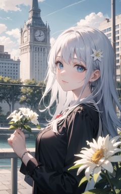 flower, lily_\(flower\), white_flower, 1girl, jewelry, earrings, daisy, white_rose, solo, blue_flower, holding_flower, rose, floral_background, blue_eyes, black_flower, bangs, long_hair, looking_at_viewer, plant, brooch, closed_mouth, portrait,building, scenery, tree, cloud,sky, house, city, outdoors, day, cloudy_sky, cityscape, blue_sky, solo, skyscraper, water, chain-link_fence, bridge, fence, real_world_location