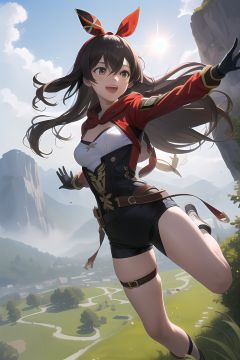 amber5star, solo, (1girl jump from the hillside, soaring into the air:1.5), arrow, bow_weapon, happy, LoL, athrill, slim legs,
