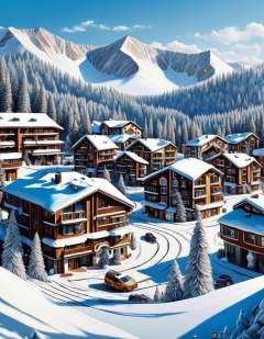 ((best quality)), ((masterpiece)), ((realistic,digital art)), (hyper detailed),DonMC0ff33Ch0c, Ski Resort Town, organic, irregular shapes , <lora:DonMC0ff33Ch0c_XL-000009:0.8>