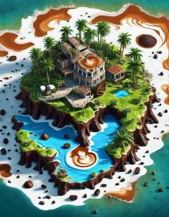 ((best quality)), ((masterpiece)), ((realistic,digital art)), (hyper detailed),DonMC0ff33Ch0c, Island, organic, irregular shapes , <lora:DonMC0ff33Ch0c_XL-000006:1.0>